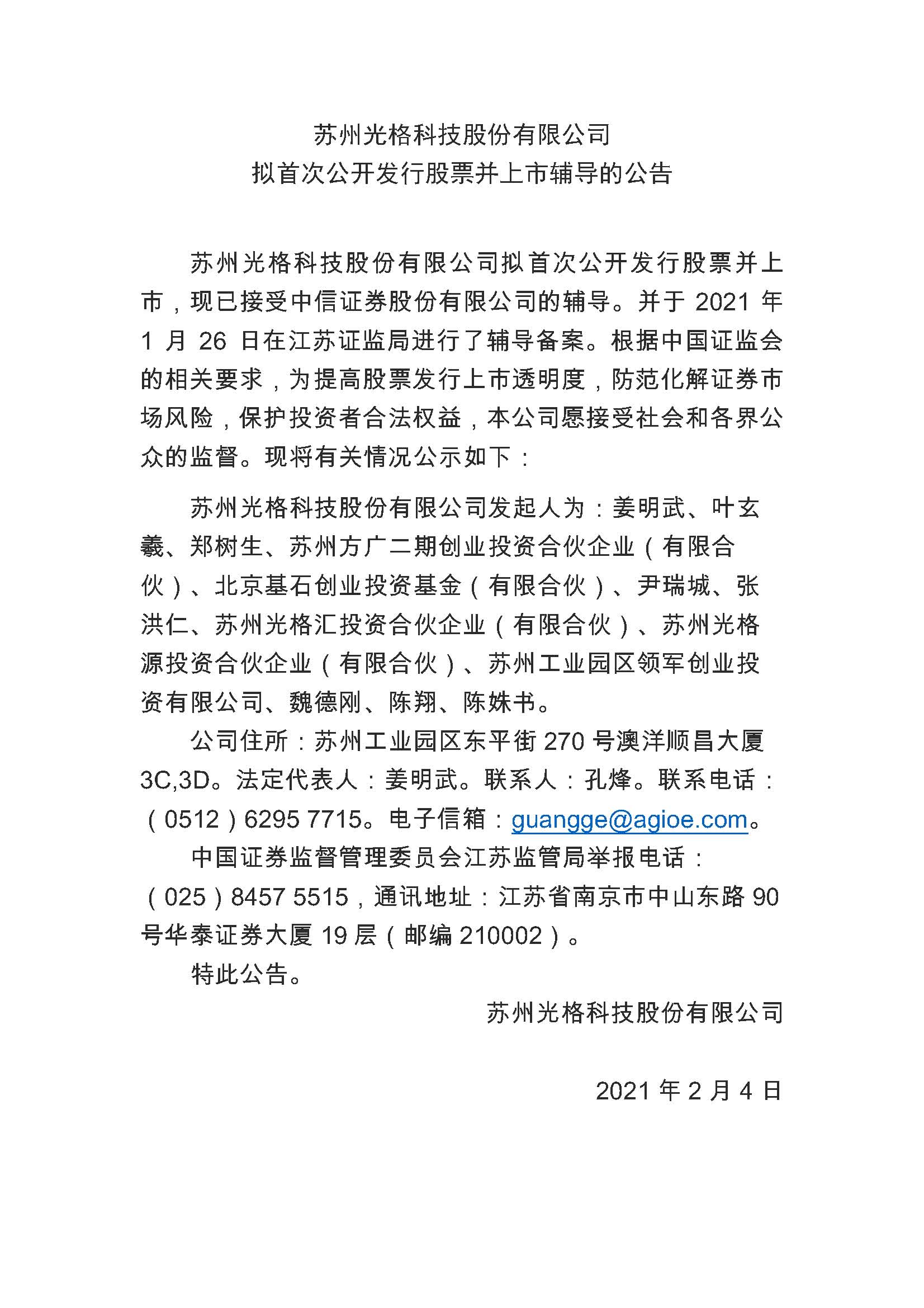 蘇州光格科技股份有限公司擬首次公開(kāi)發(fā)行股票并上市輔導的公告