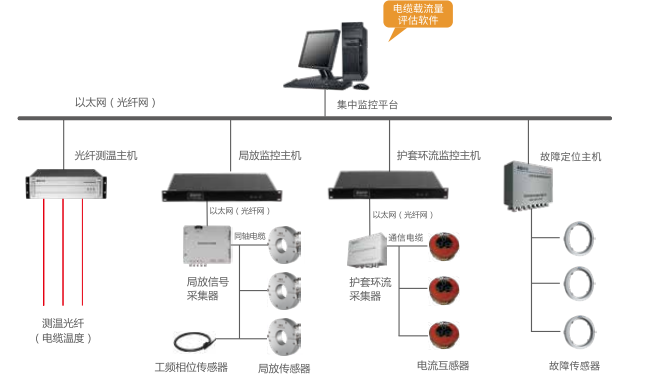 電纜本體狀態(tài)監測系統主要包含電纜溫度監測及載流量評估系統、局部放電監測系統、護套環(huán)流監測系統和故障定位系統。采用電纜本體在線(xiàn)監測手段,實(shí)時(shí)監控電纜運行溫度及接地環(huán)流數據、局部放電信號和電纜故障行波信號。通過(guò)多種監測數據診斷電纜運行狀態(tài),對異常情況進(jìn)行及時(shí)預警,保障電纜運行安全。當電纜發(fā)生跳閘故障時(shí),可提供故障分區、故障點(diǎn)位置等信息,減少電纜故障運維時(shí)間。